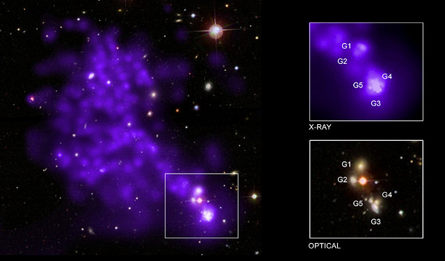 Le galassie che si stanno avvicinando ad Abell 2142 sono visualizzate nell’immagine in basso (NASA/CXC/Univ. of Geneva, D. Eckert. Optical: SDSS provided by CDS through Aladin) con un ingrandimento ai raggi X nel riquadro superiore e a frequenze ottiche in quello inferiore che mostra le galassie G1, G3, 64 e G5 assieme alla galassia G2, che è sullo sfondo e non parte del gruppo. Le quattro galassie formano la parte più luminosa di una sorta di coda che esce da un gruppo più grande mentre una parte del suo gas viene strappata via a causa degli effetti gravitazionali.
