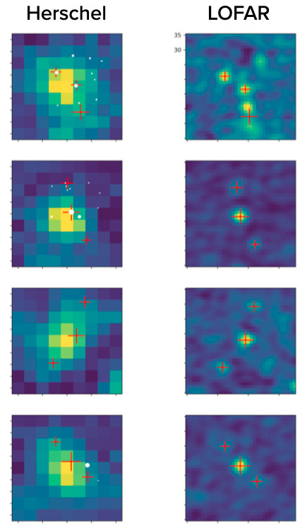 Il team di Lingyu Wang ha condotto un nuovo studio sulle fonti infrarosse iperluminose utilizzando il radiotelescopio LOw Frequency ARray (LOFAR), che ha una risoluzione spaziale più elevata ed è quindi in grado di distinguere le galassie individuali. L’immagine in basso (Cortesia Istituto Olandese per le Ricerche Spaziali, tutti i diritti riservati) mostra un gruppo di galassie iperluminose viste da Herschel (a sinistra) e LOFAR (a destra).