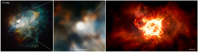 L’immagine qui sotto (NASA, ESA, and R. Humphreys (University of Minnesota)) mostra a sinistra la grande nebulosa che circonda VY Canis Majoris vista da Hubble, al centro un particolare dell’area centrale con la zona vicina alla stella e a destra una rappresentazione artistica della stella.