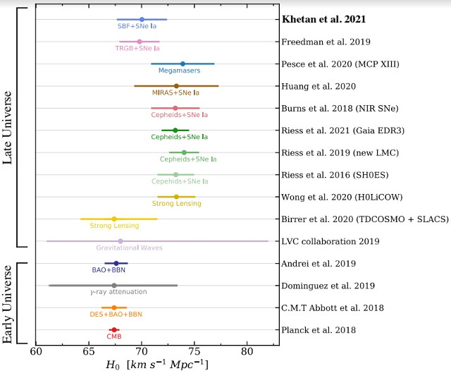 La costante di Hubble, com’è chiamata la velocità di espansione dell’universo, è stata calcolata in parecchi modi diversi che vanno dall’uso della radiazione cosmica di fondo a quello di supernove, quasar, cefeidi, giganti rosse e altro ancora. Quella che è stata definita una tensione nel campo della fisica è causata da valori incompatibili tra di loro, troppo diversi anche tenendo conto dei margini di errore. Una possibilità è che sia necessario espandere le nostre conoscenze della fisica per trovare la spiegazione ma forse il problema è nei limiti dei nostri strumenti. L’immagine in basso (Cortesia Khetan et. al) mostra diversi valori della costante di Hubble calcolati negli ultimi anni in vari modi.
