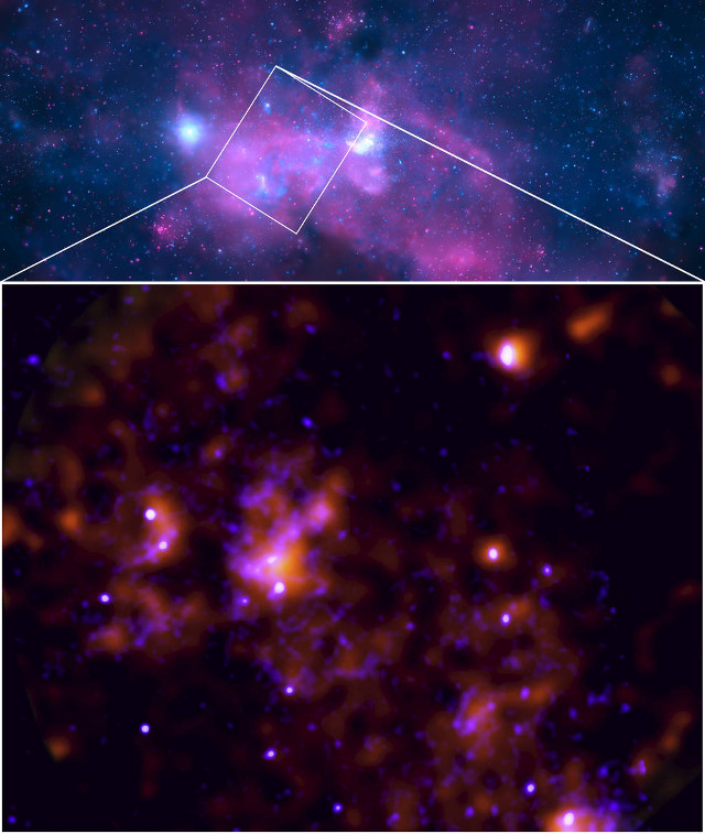 L'area attorno a Sagittarius A* (Immagine IXPE: NASA/MSFC/F. Marin et al; Chandra: NASA/CXC/SAO; Image Processing: L.Frattare, J.Major & K.Arcand)