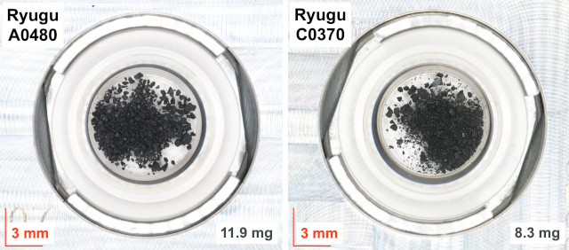 La foto (Cortesia JAXA / JAMSTEC. Tutti i diritti riservati) mostra i campioni raccolti dalla sonda spaziale Hayabusa 2 in due occasioni diverse dal primo e dal secondo sito selezionati sull’asteroide Ryugu.